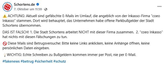 Facebook: Unter den gefälschten E-Mails leidet nicht nur die Coeo Inkasso GmbH, sondern beispielsweise auch die Stadt Schortens.