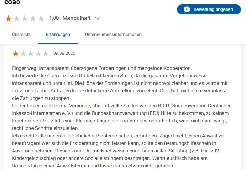 Unsere umfassende Analyse zeigt, dass die Coeo Inkasso GmbH ein seriöses, in Deutschland registriertes Inkassounternehmen ist, das auf Trustpilot mit 4,6 von 5 Sternen (bei über 8.800 Bewertungen) ein überraschend positives Feedback für seinen digitalen Service erhält. Es handelt sich also nicht um eine Fake-Firma.