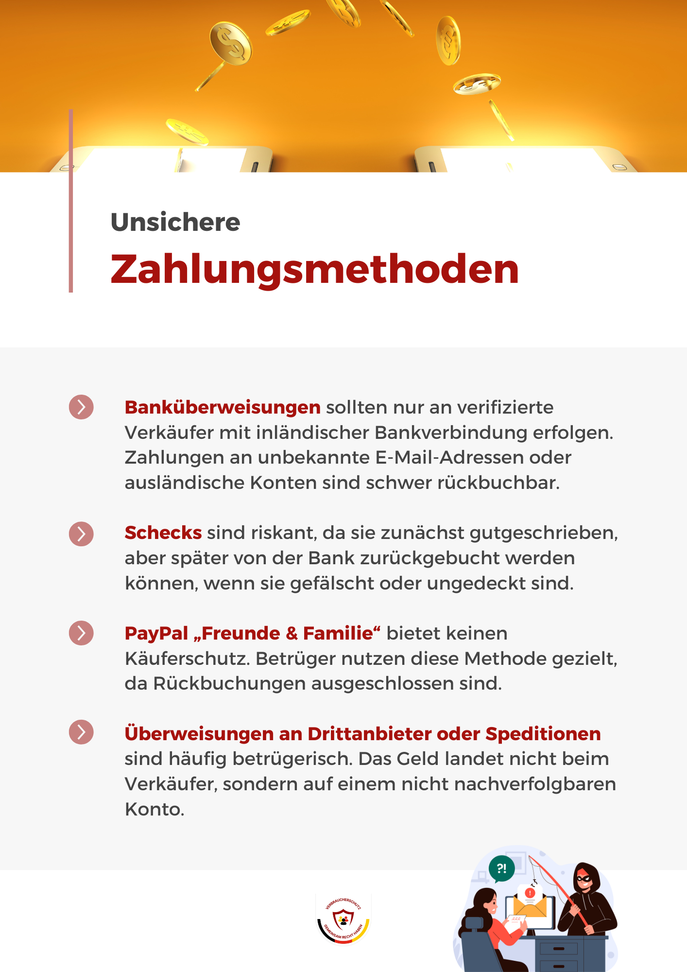 Banküberweisungen sollten nur an verifizierte Verkäufer mit inländischer Bankverbindung erfolgen. Zahlungen an unbekannte E-Mail-Adressen oder ausländische Konten sind schwer rückbuchbar.