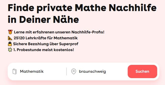 Die Seite von Superprof ist ein Vorbild an Benutzerfreundlichkeit – bis zum Bezahlvorgang. Die Suchfunktion ist prominent, schnell und intuitiv. Man gibt ein Fach (z.B. „Mathe“) und seinen Standort ein und erhält sofort Profile.